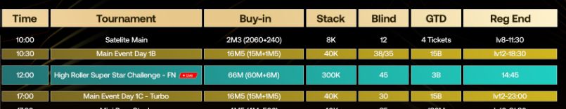 Với mức buy in 16.5M cực hợp lý với field người chơi Việt Nam cho một Main Event của series. Starting stack đẹp với 50k, chắc chắn sẽ làm các người chơi multiday hài lòng thể hiện mình với đủ các giai đoạn deep, middle, short stack. Flight 1A sẽ bắt đầu vào lúc 11:30 và kết thúc đăng ký vào lúc 19:30.
